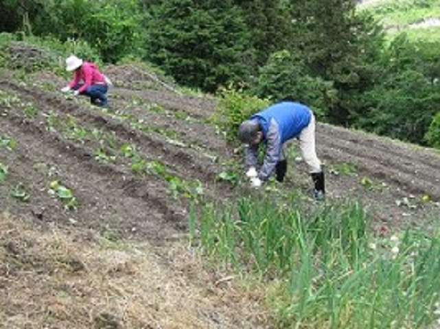 ワラビ、フキ、ゼンマイなど山菜がよく採れます。写真はタケノコ堀りです。採れる時期がありますので、お問い合わせください。